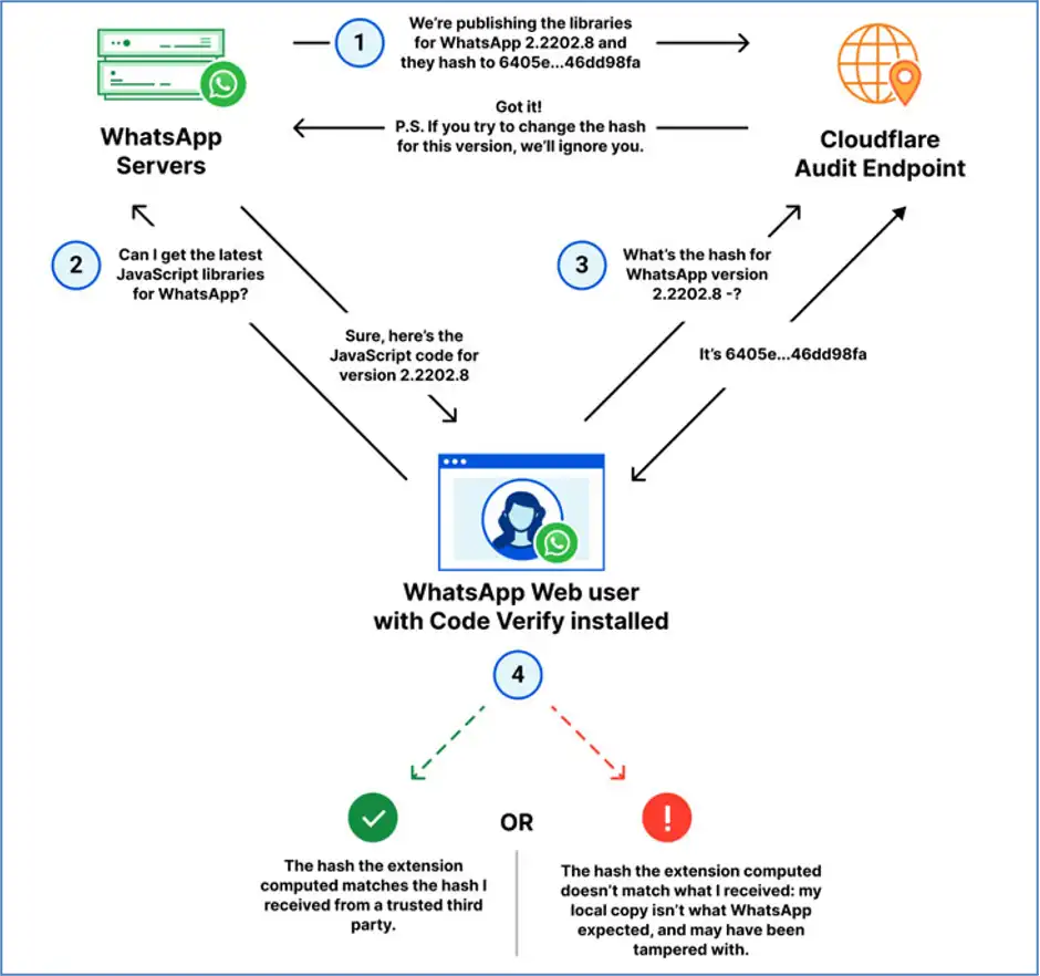 The system uses Cloudflare as a third-party audit to compare the cryptographic hash. It compares the JavaScript code shared by Meta for WhatsApp Web to a locally generated hash of the code running on the browser client.