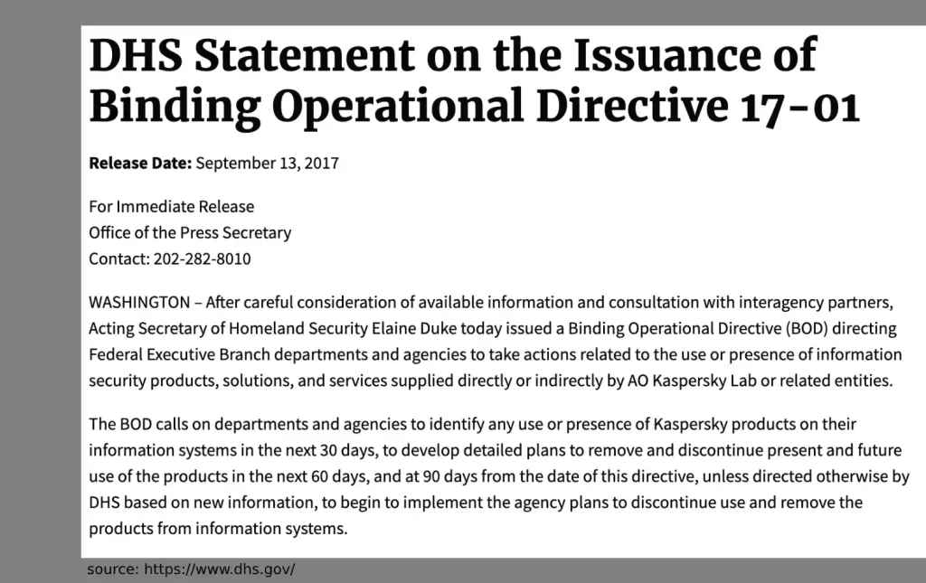 Below is an archived snapshot of the DHS directive that explains the US government’s decision to remove Kaspersky software from government PCs.